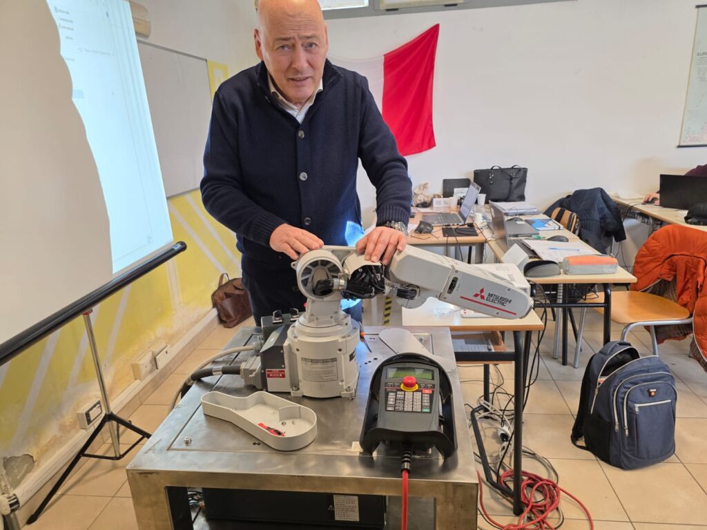 Grazie alla combinazione dei movimenti sugli assi cartesiani X, Y e Z e delle rotazioni A, B e C, questi sistemi sono in grado di eseguire operazioni complesse con grande accuratezza. Durante le esercitazioni, gli studenti hanno lavorato con il robot industriale MELFA RV-2FR, un braccio compatto progettato sia per applicazioni industriali sia per la formazione.